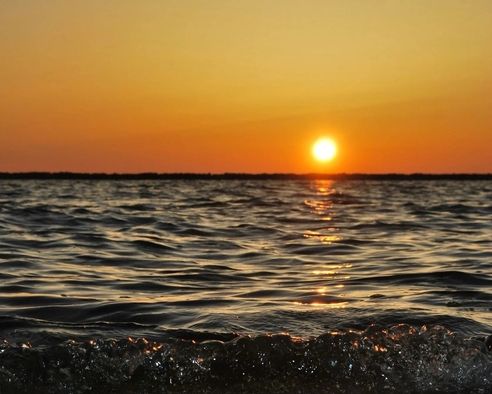 Sunset over the ocean with the reflection of the sun on the water, and a clear sky with a gradient of orange and yellow